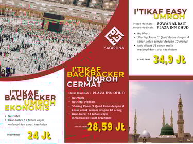 Nikmati perjalanan spiritual yang tak terlupakan di Tanah Suci bersama Safaruna. Kami menghadirkan paket Umroh & I'tikaf Ramadhan dengan pilihan yang fleksibel dan harga yang terjangkau, sehingga Anda dapat beribadah dengan khusyuk dan nyaman di Makkah dan Madinah.